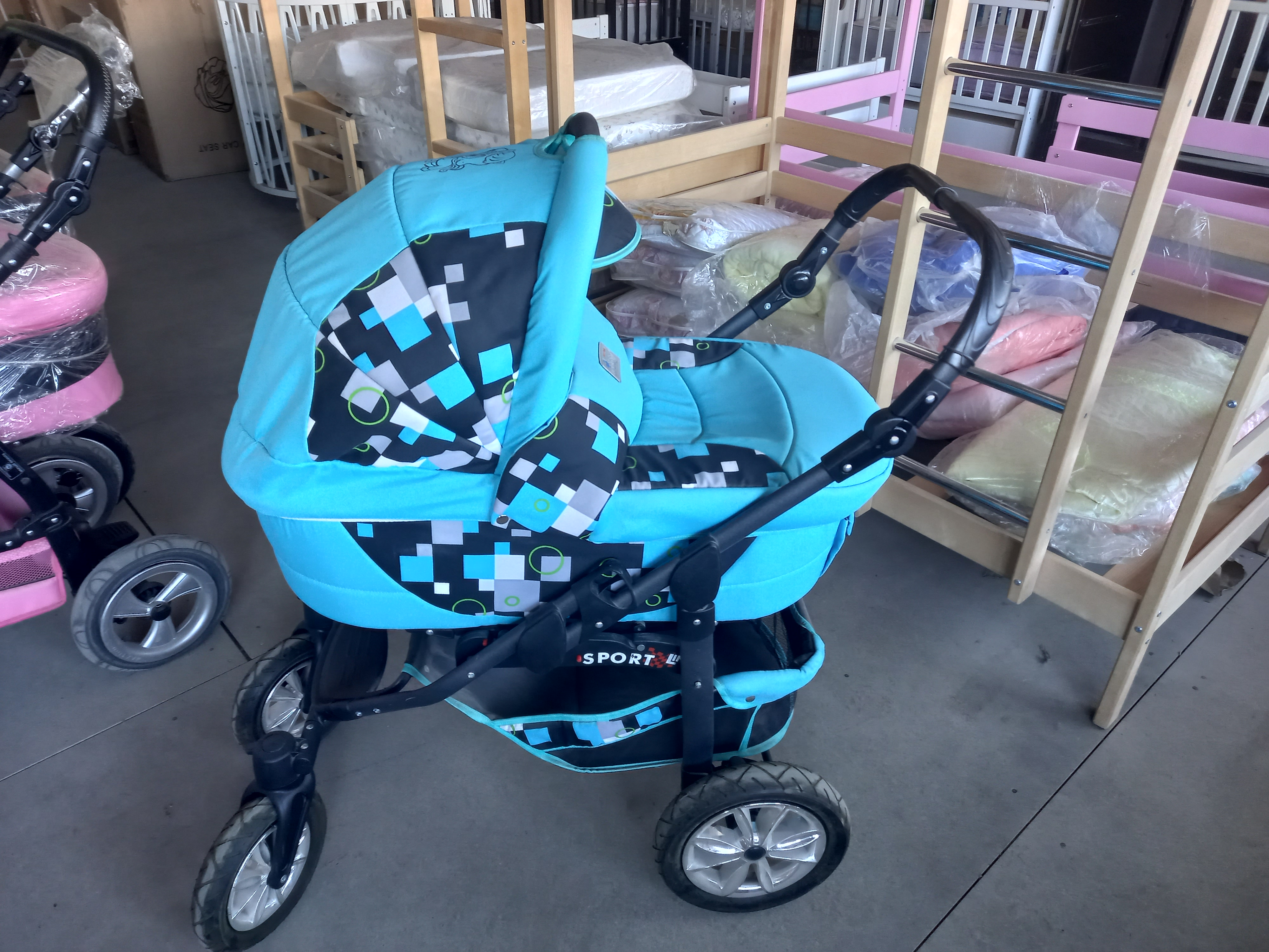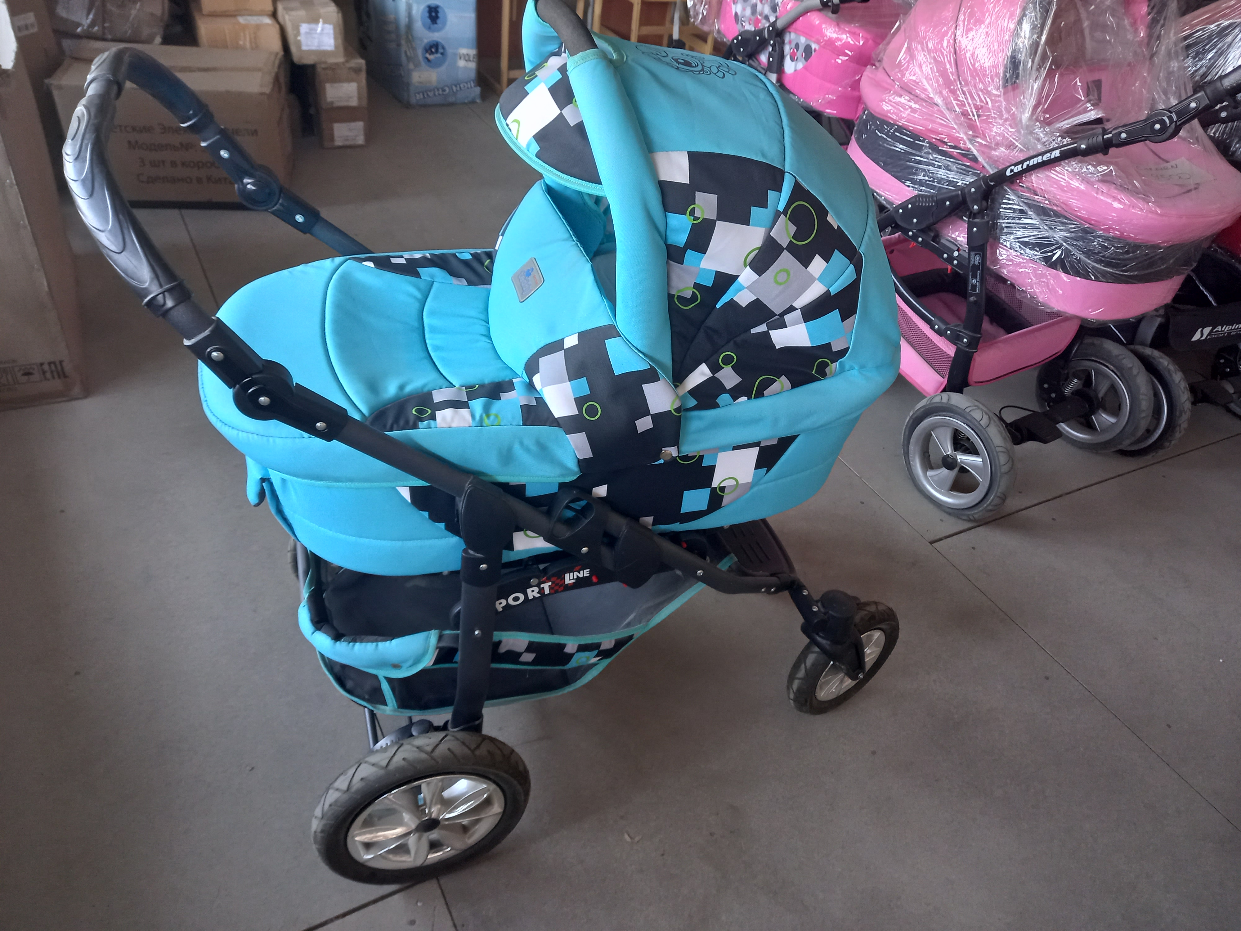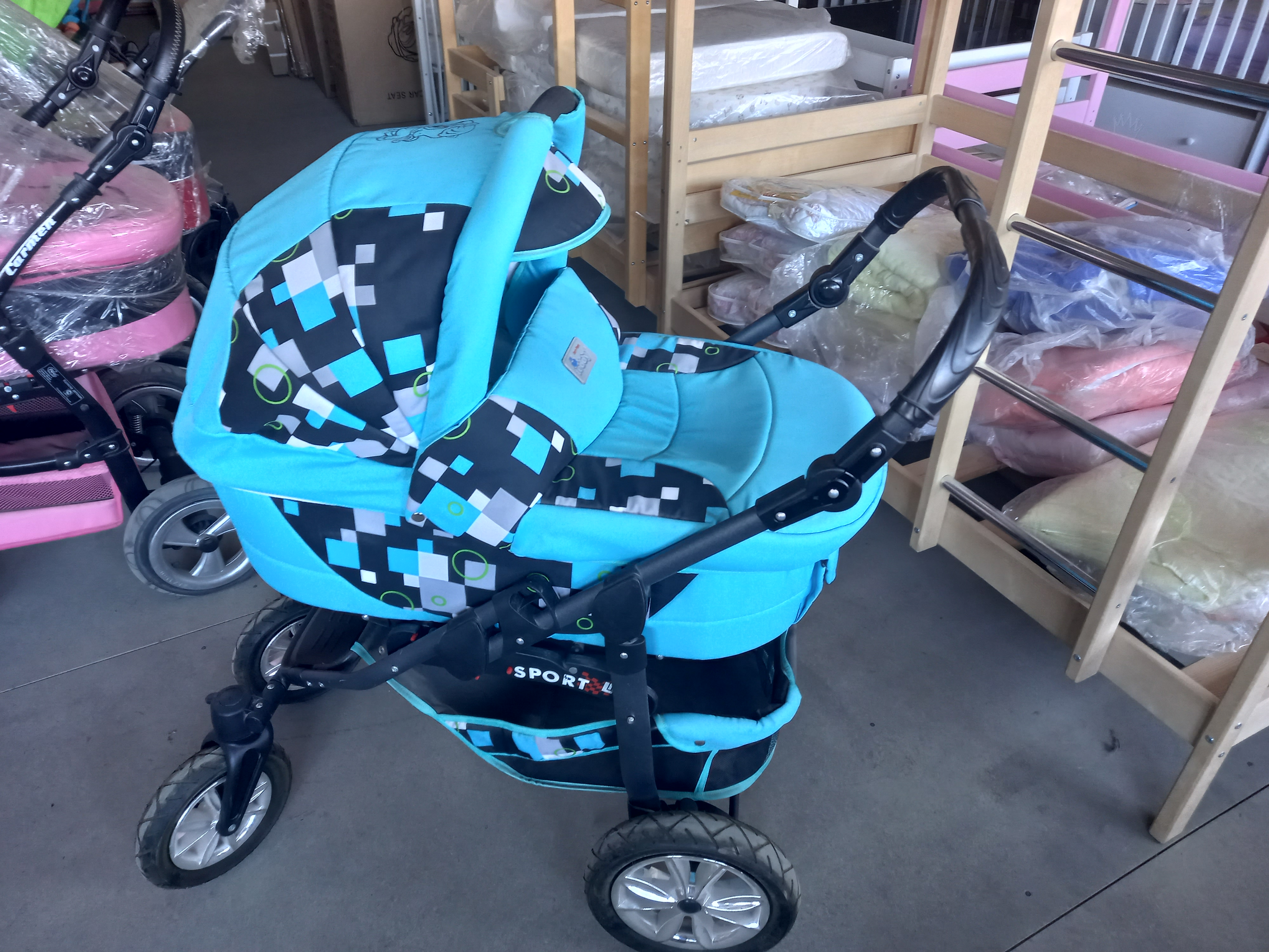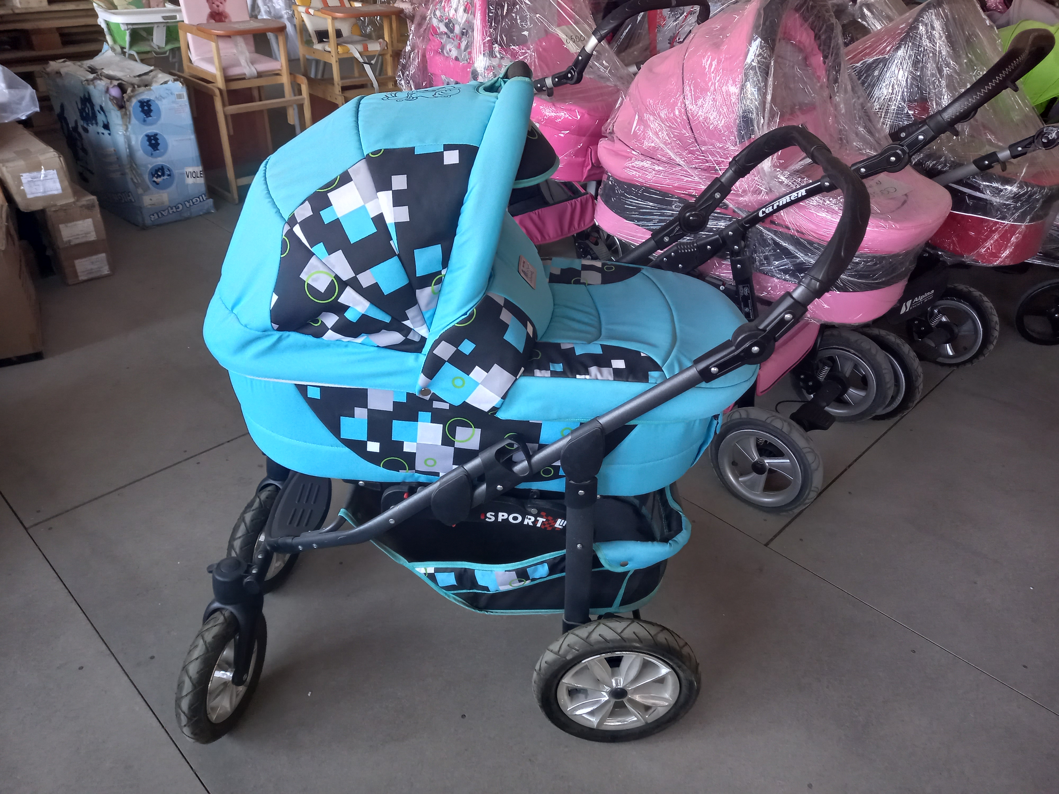 Коляска 2 в 1 Bart-Plast Sportline PCO - это комбинированная коляска: съемная люлька и прогулочное сидение, колеса надувные (передние вращающиеся), сумка для мамы, сетка для продуктов, регулируемая спинка, регулируемая подножка, чехол от дождя, амортизаторы.